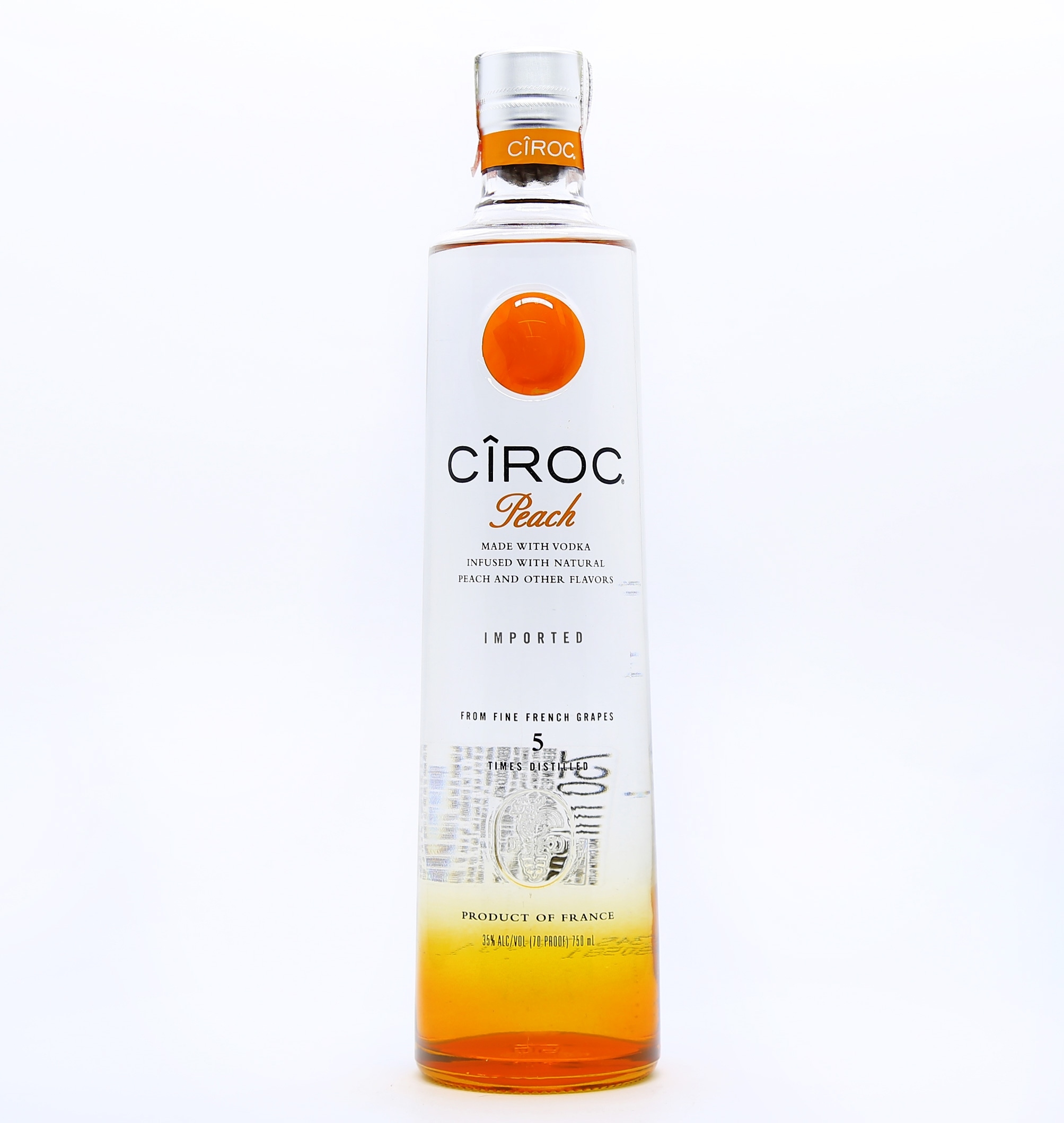Vodka Cîroc Peach 750 ml. Vodka francesa. Ao contrário da maioria das vodkas, a base de grãos, Cîroc é produzido a base de uvas nobres. Sua essência são as uvas Mauzac Blanc e Ugni Blanc, cultivadas em Gaillac, região de origem dos mais nobres vinhos franceses. Seu processo de produção, quase artesanal, utiliza fermentação fria, que mantém o frescor e as características marcantes da uva. Graduação alcoólica 35%. Conteúdo 750ml. Vodka importada da França.