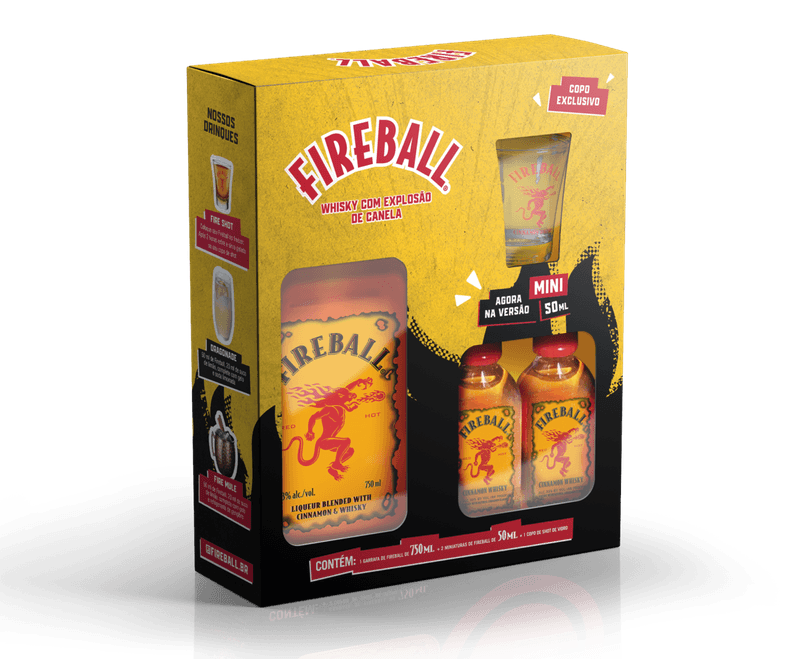 Kit Whisky Fireball: Sabor Intenso e Celebração Garantida! Prepare-se para aquecer suas noites com o Kit Whisky Fireball, perfeito para quem busca um toque de canela e pimenta em suas celebrações! Este kit é ideal para presentear ou para desfrutar de momentos inesquecíveis com amigos. O que você encontra neste kit? 1x Garrafa de Whisky Fireball Cinnamon Whisky (750ml): O sabor icônico da canela com um toque de calor, perfeito para ser apreciado puro, com gelo ou em drinks criativos. 2x Miniaturas de Whisky Fireball Cinnamon Whisky (50ml cada): Leve o sabor de Fireball para onde quiser! Ideal para experimentar, para shots rápidos ou como lembrancinha. 1x Copo de Shot de Vidro Personalizado: Para brindar com estilo e elevar a experiência de cada dose de Fireball.