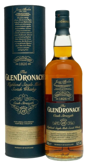 O GlenDronach Cask Strength é um whisky Highland Single Malt escocês conhecido por ser uma "Sherry Bomb" (explosão de xerez), engarrafado em sua força natural de barril, sem diluição, filtragem a frio ou adição de corantes.