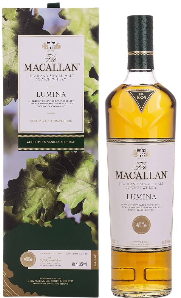 Um whisky ousado e picante com notas de baunilha cremosa, especiarias de madeira e gengibre. O Macallan Lumina abraça a direção da jornada onde mundos antigos e novos combinam mais de 15.000 milhas para encontrar três tipos exatos de barris. Os barris de carvalho europeu e americano com xerez são combinados com barris de barris para criar um espírito que se baseia no velho mundo, mas inspirado no novo. Caracterizado por seus arrojados sabores com notas de baunilha cremosa, gengibre e especiarias de madeira, trata-se de um uísque de malte único que renova a busca pela excelência. Com seu design verde floresta, Lumina ilustra a visão da copa das árvores e dicas de luz através das folhas à medida que a jornada avança.